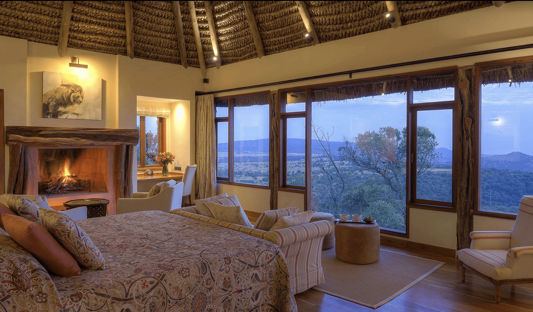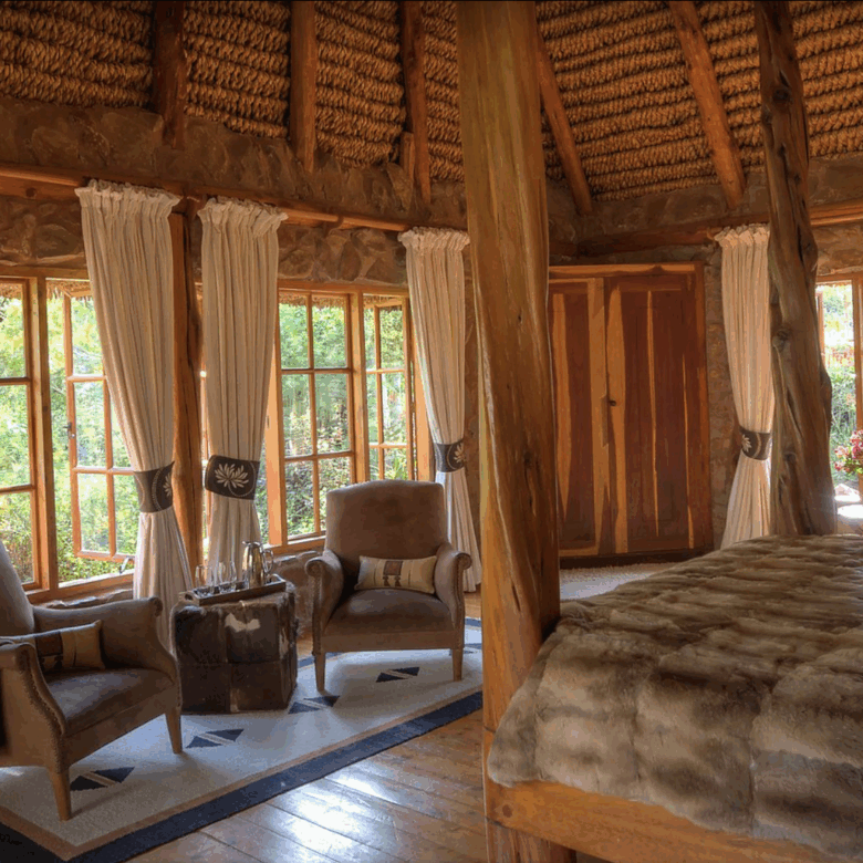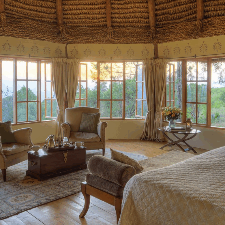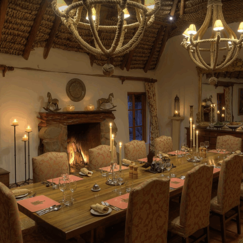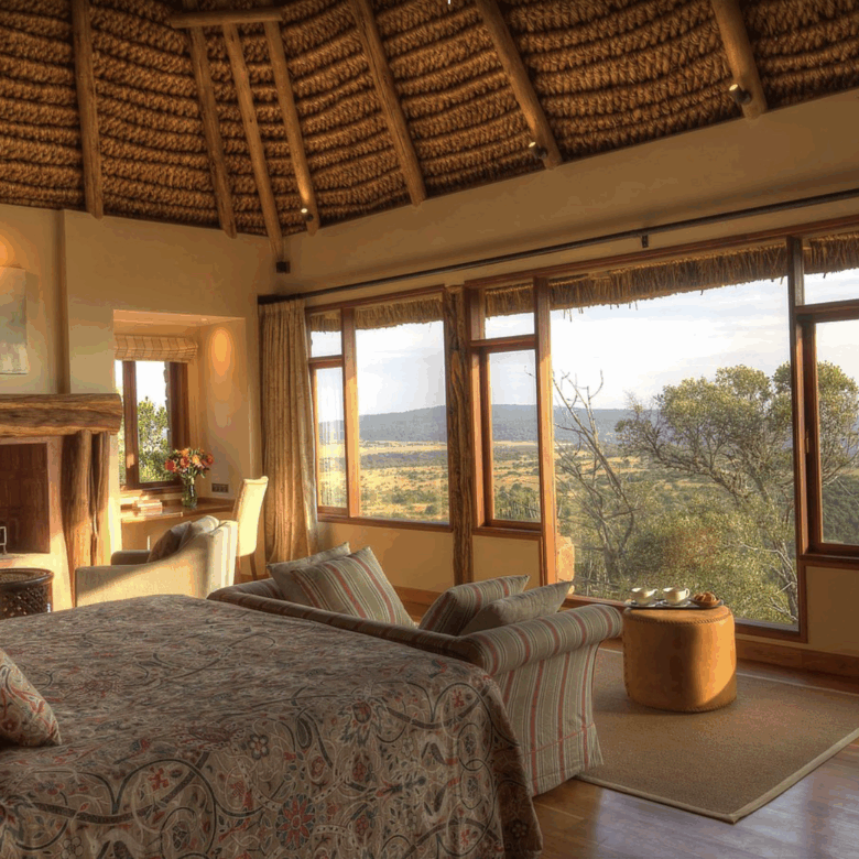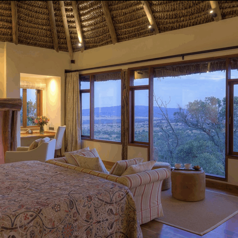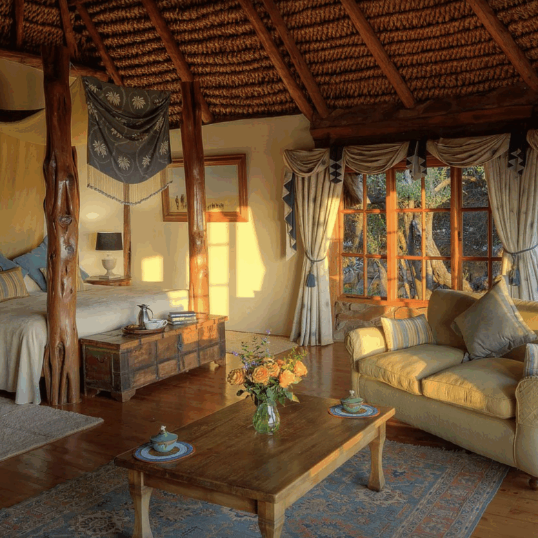 Designed with comfort and grandeur in mind, Laragai House accommodates up to 16 guests across eight elegantly appointed en-suite bedrooms. The interiors combine rustic charm with refined elegance—stone fireplaces, rich wooden accents, and expansive living spaces overlooking the Laikipia plains and Mount Kenya. Each room opens onto sweeping views, where guests can wake up to the sight of elephants grazing or hear the distant roar of lions at night.