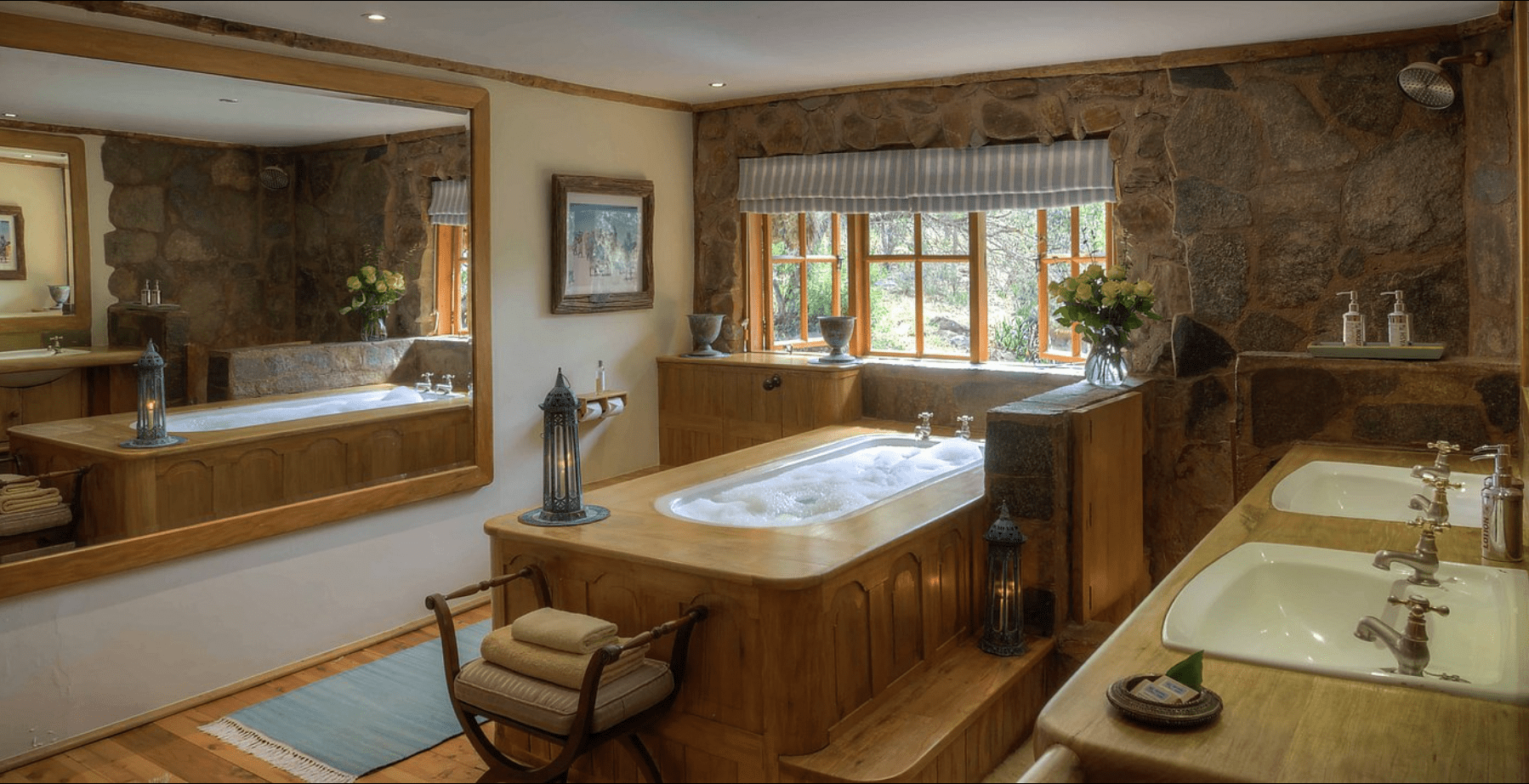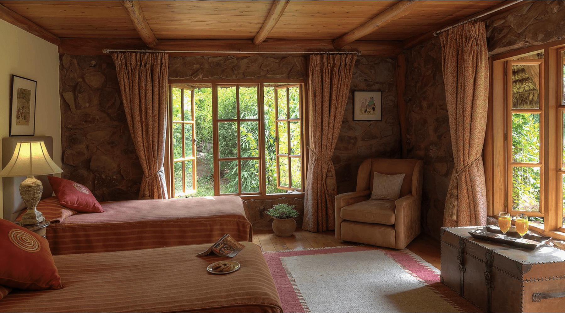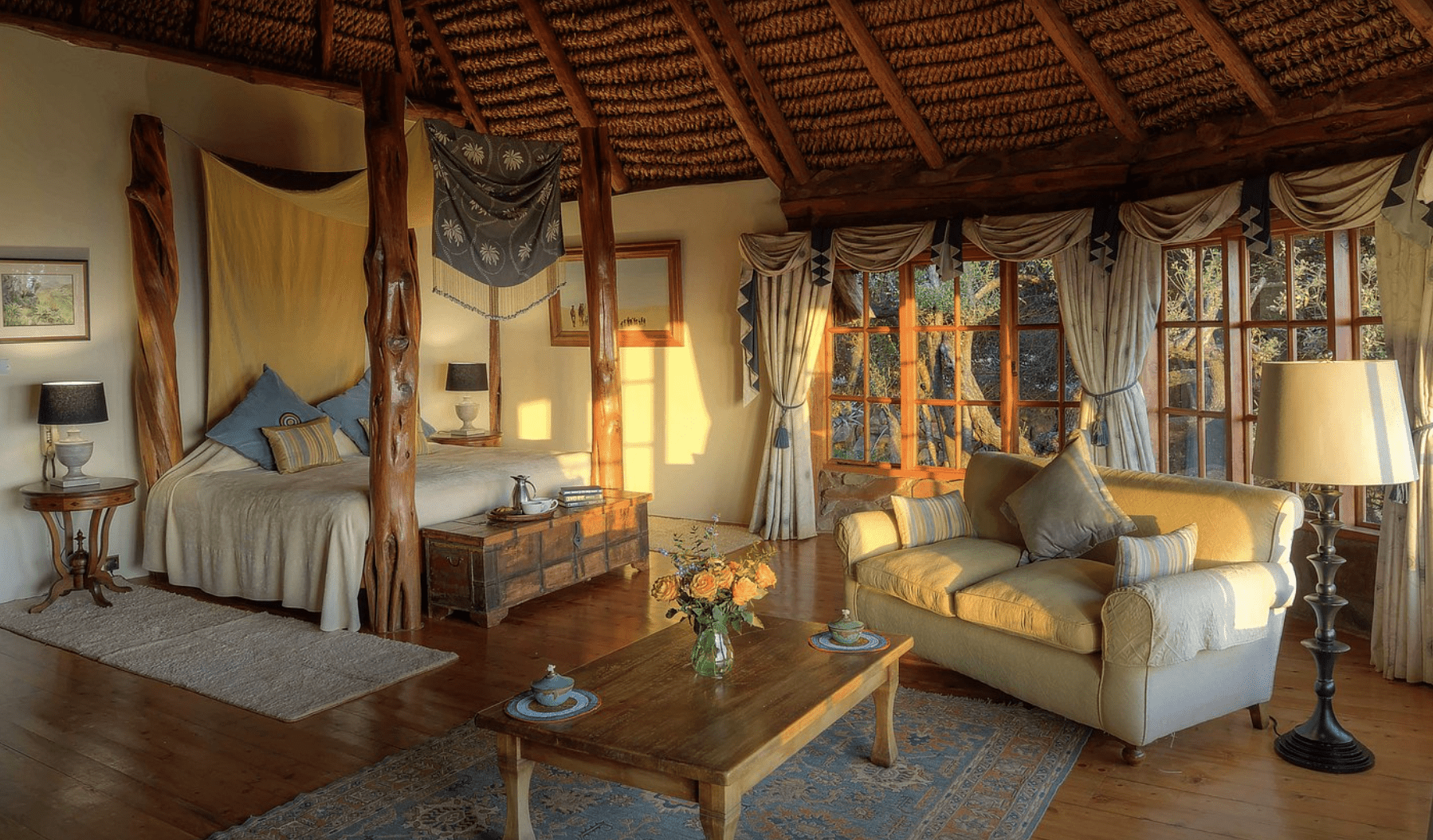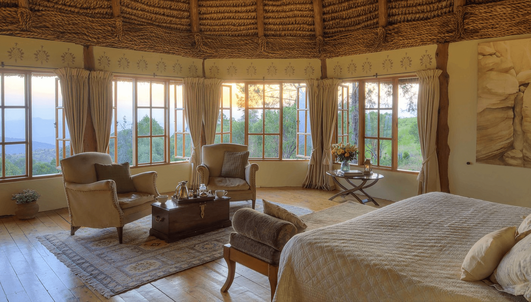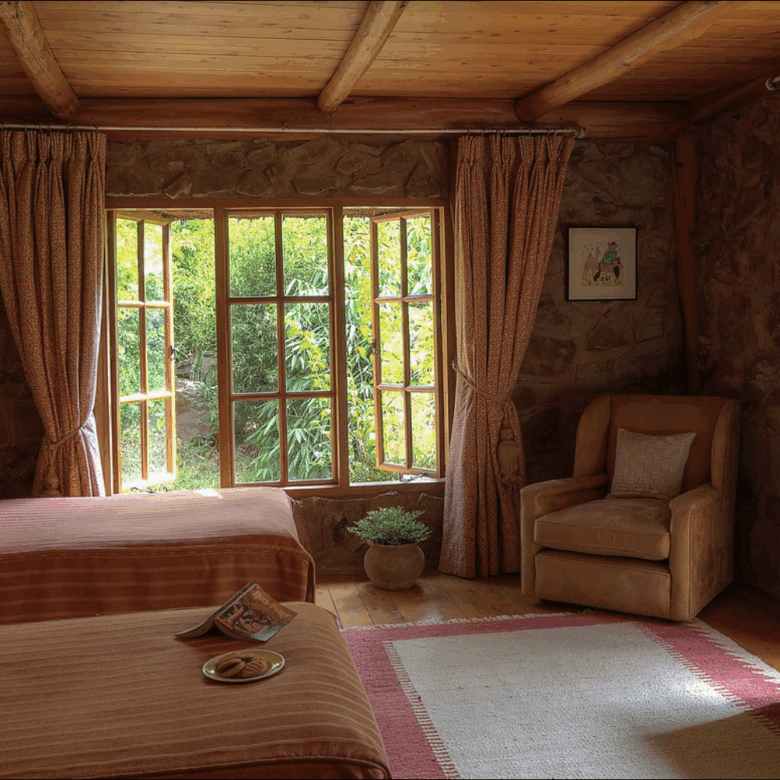 Designed with comfort and grandeur in mind, Laragai House accommodates up to 16 guests across eight elegantly appointed en-suite bedrooms. The interiors combine rustic charm with refined elegance—stone fireplaces, rich wooden accents, and expansive living spaces overlooking the Laikipia plains and Mount Kenya. Each room opens onto sweeping views, where guests can wake up to the sight of elephants grazing or hear the distant roar of lions at night.